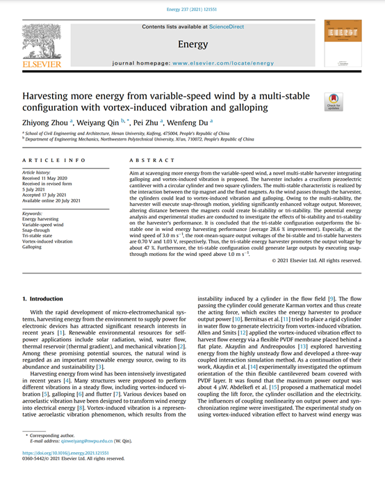 周志勇副教授课题组在国际能源类知名期刊《Energy》(中科院JCR Top期刊,影响因子7.147)上发表题为“Harvesting more energy from variable-speed wind by a multi-stable configuration with vortex-induced vibration and galloping”的研究论文。该研究成果是土木建筑免费成人电影